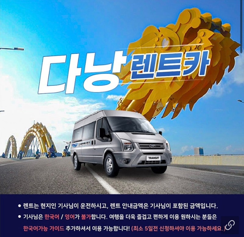 다낭 렌트카는 승객 수에 따라 달라지므로 탑승 인원이 몇 명인지 아는 것이 중요합니다. 4인승: 최대 2명 7인승: 최대 5~6명 / 짐이 있는 경우 최대 4명 16인승: 최대 8~13명 / 짐이 있는 경우 최대 1인 기본 예약비 8명까지는 20,000원입니다. 4인은 6시간에 20달러, 7인은 25달러입니다. 가장 많이 이용하는 12시간 기준 4명이 30달러, 예약비까지 포함하면 6만원 안팎이다. 하루 12시간 사용하는데 6만원이면 2인이 각각 3만원만 내면 정말 저렴한 것 같아요. 여기를 클릭하시면 자세한 가격을 확인하실 수 있습니다. 다낭 가볼만한 곳을 모아보세요. 다낭렌터카 당일치기 여행 코스입니다.