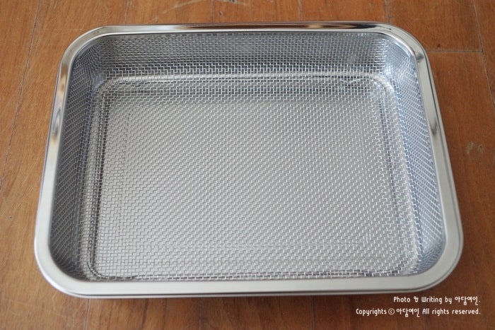 이렇게 가방에 쏙 들어가는 사이즈라서 야채를 씻어서 보관할 때 바닥에 닿지 않고 띄울 수 있어서 물빠짐에도 좋아요. 사이즈가 커서 설거지 후 접시를 담아두기도 좋고, 건조대로 활용하기도 좋아요. 튀길 때 기름을 빼는 데에도 좋습니다. .