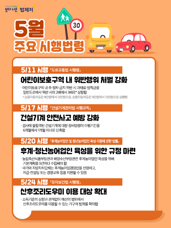 어린이 보호구역 같은 경우에는 특정 시설에서 장소 위주로 확대되며,교통사고 가능성이 높은 곳 역시 보행자 보호구역으로 추가되었다고 합니다.즉! 지금까지는 어린이나 노인, 장애인 등 특정 보호 대상자들을 위한보호구역만 있었다면 앞으로는 교통사고 가능성이 높은 곳도 보행자 보호구역으로추가 지정 되게 된다는 것입니다.추가된 보호구역을 좀 더 상세하게 안내해 드리도록 하겠습니다.ⓐ 아파트 단지 내 통행로ⓑ 대학교 안 구내 도로ⓒ 놀이터 주변ⓓ 노인 보호 전문기관 & 일자리 지원 기관 & 학대 피해 전용쉼터 인근 도로ⓔ장애인 지역사회 재활시설 & 직업재활시설 & 의료재활시설 인근 도로추가된 보호구역 역시 30Km 이상 속도로 주행하게 되는 경우 단속이 이루어지며,적발 시 7만 원 이상의 과태료 부과되게 됩니다.『위반된 속도에 따라 더 높게 부과될 수 있습니다.』첫 번째보행자 보호구역이 확대된다고 합니다.